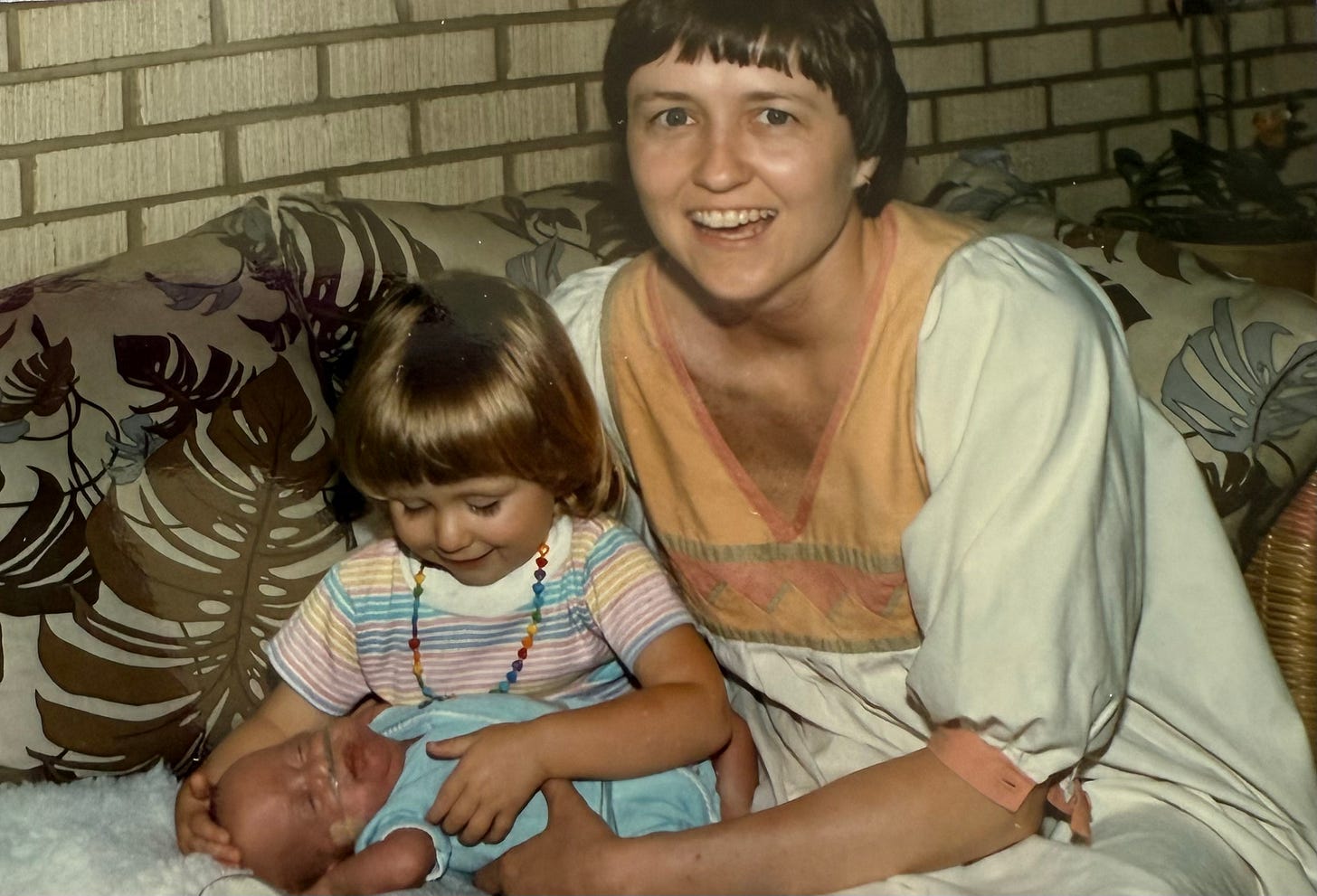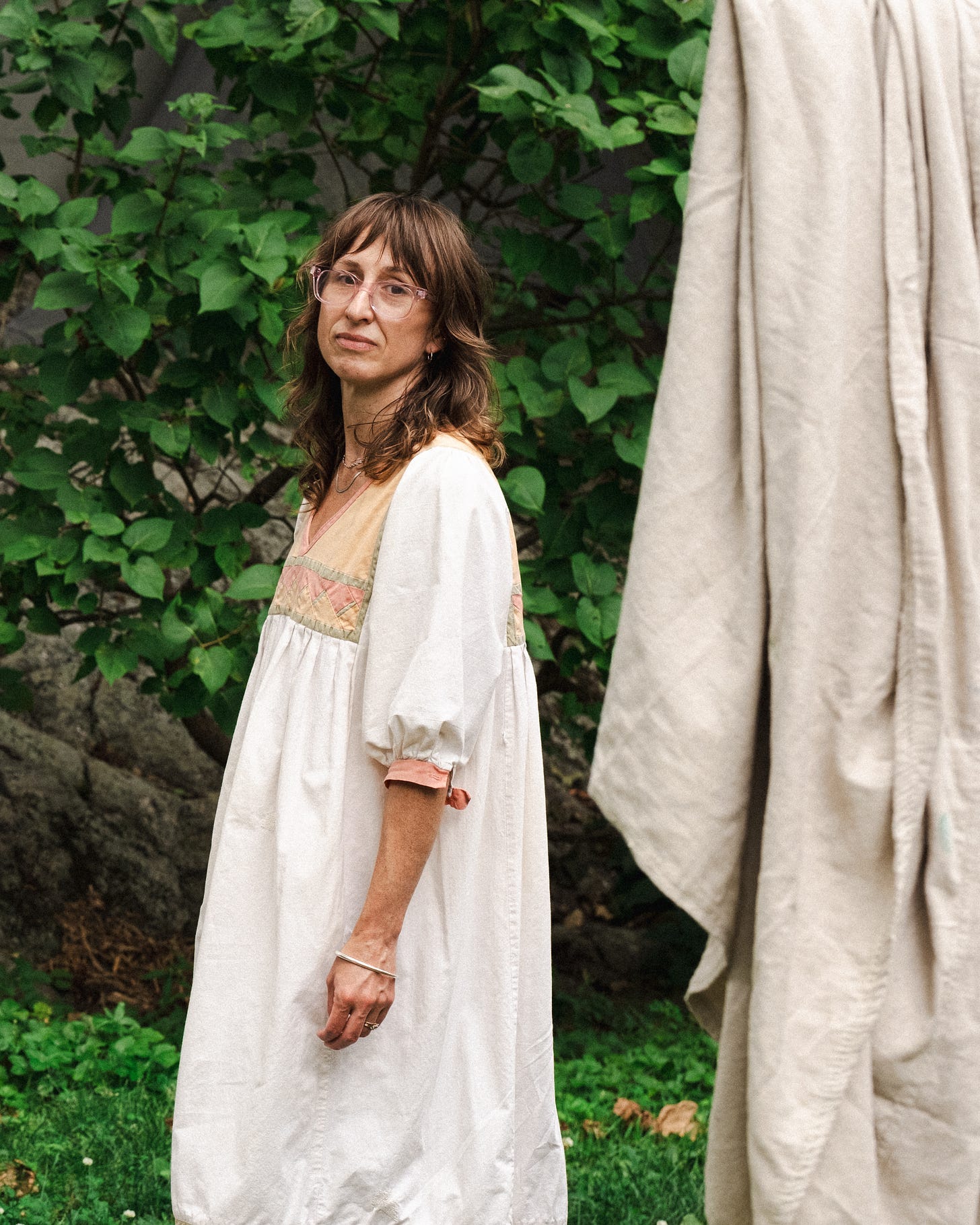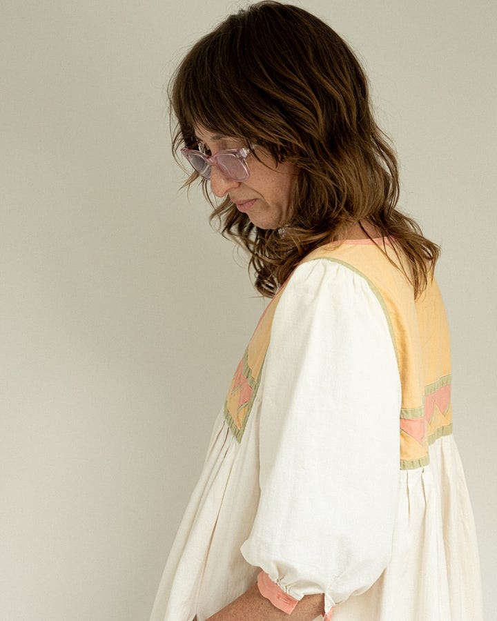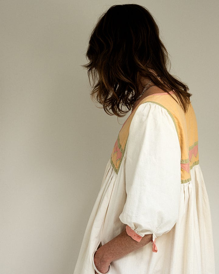 My mom bought this dress in the 70s and wore it often while we were kids. She gave it to me when I was in art school, I'd always coveted it. The fabric is really beautiful and substantial. I mended over the many areas of stains and wear over the years. (One of my favorite things about vintage whites is that they're usually already imperfect and ready to be worn fearlessly!) I wear it often but especially loved wearing it while pregnant with my daughters. There was something so special about wearing it at that time, knowing my mother had done the same.