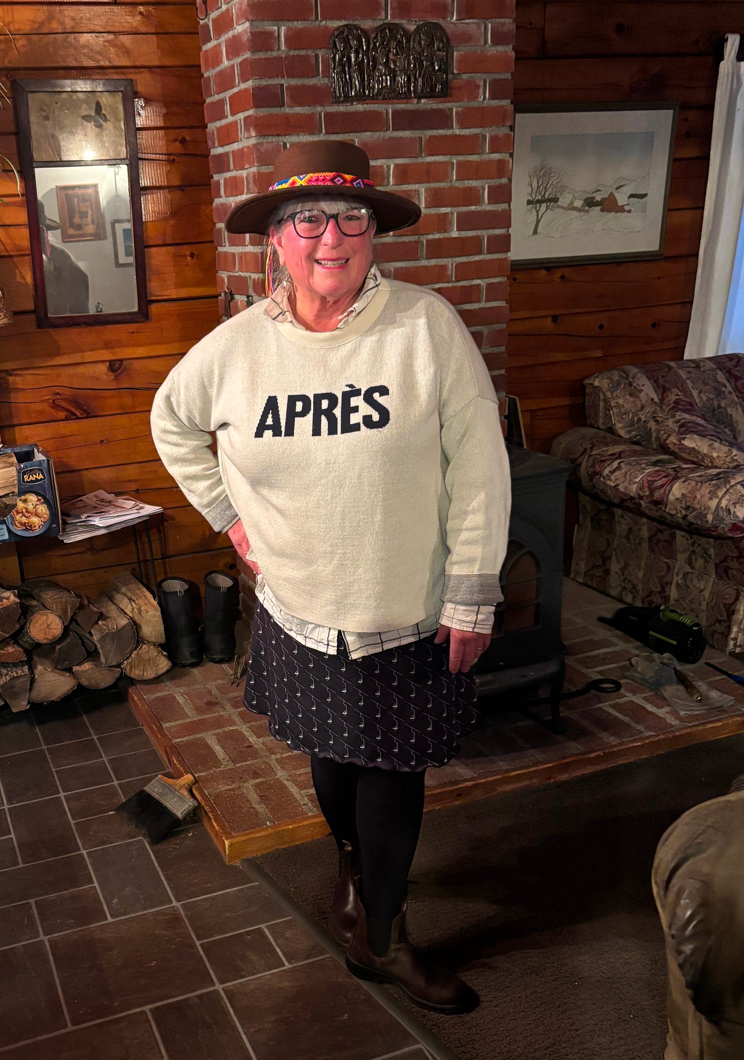 So I do a similar thing if I’m going to meet friends after skiing. I have a pair of shorts that are like those skirts [puffy jacket material]. You throw them on over your long johns and then you get a cool hat because your hair looks crazy, and a big puffy turtleneck that you balled up in your coat bag, and you go and have a beer at the end of a long ski day.