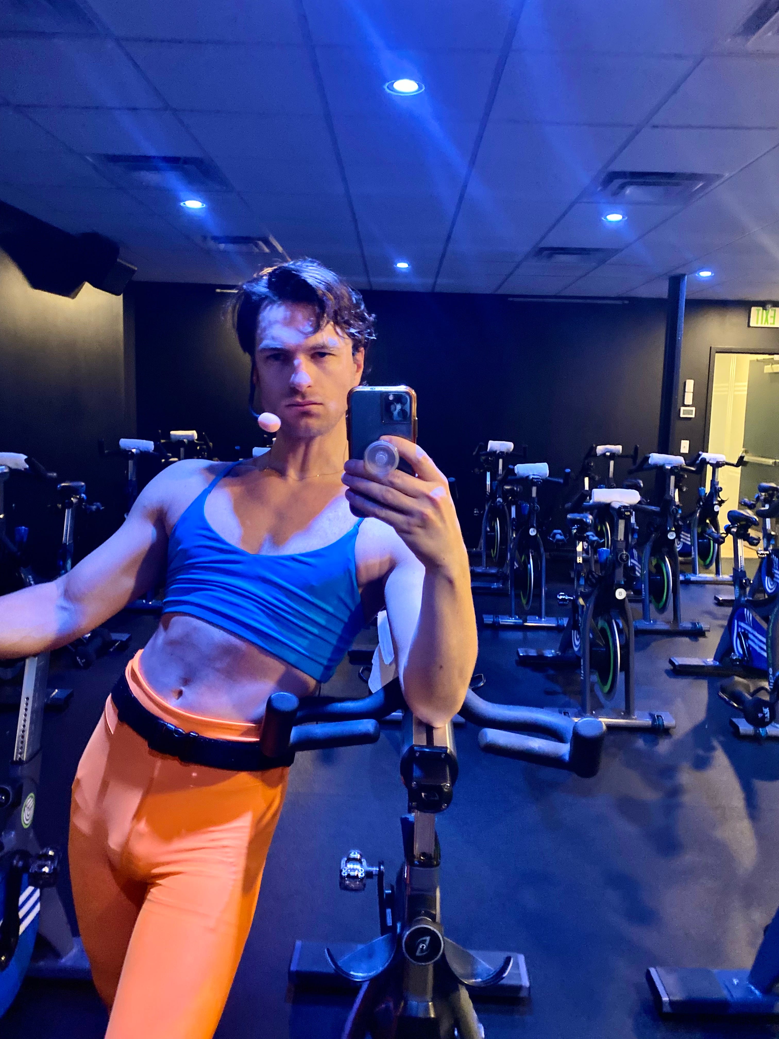 With Jibe it’s been a long journey. I started wearing women’s athletic gear when I started teaching almost three years ago. When I started riding I didn’t think that riding shirtless was an option; I didn’t want there to be any perception of toxic gym culture, like guys in the gym who are grunting or shirtless in a women’s dominant space. So I wear men’s biker shorts, or women’s cycling leggings, and then a sports bra. The low-support sports bras work perfectly for me. I don’t need the support and I started wearing them because it’s very warm in the Spin Studio. It also makes me feel incredibly strong when I’m gearing up to lead a full class of people through a workout. I’m looking in the mirror in this outfit that’s made for women, and there is so much strength in the feminine form and I feel like I’m getting to soak up a little bit of that residually.