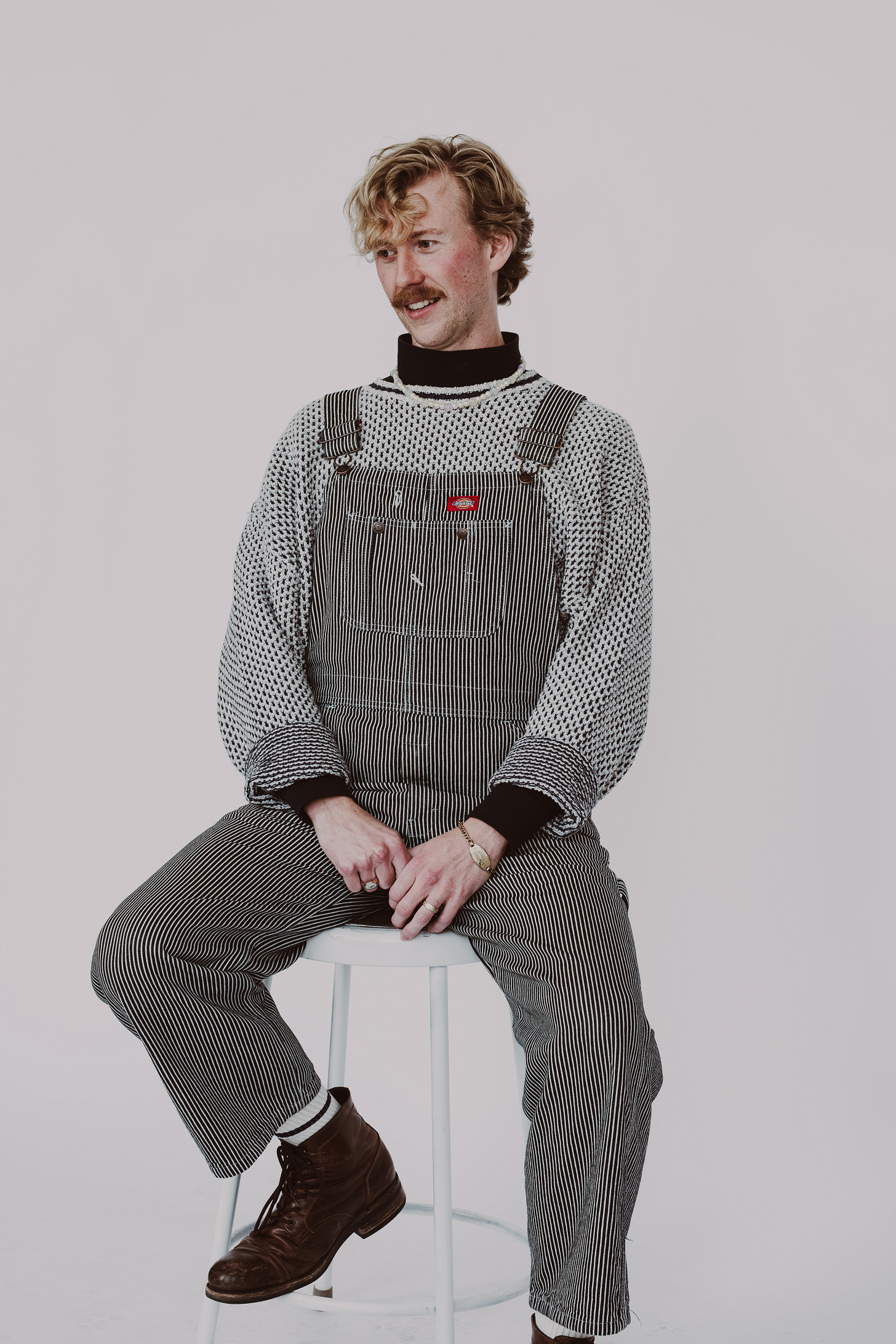 I love vintage sweaters with all my heart, but they will not be touching my bare skin at all costs [laughs]; these mock necks come in handy for that. I also just like doing different fits through layering. Like this sweater, it’s absolutely enormous, but I can tuck it into my overalls and you wouldn’t know that the sweater is like, 10 feet long. And I can roll up the sleeves and you see a well-fitted mock neck underneath. It’s a way of showing there is form to this, and there is a body underneath. I like the way those types of pieces interplay, the idea of loose with fitted.